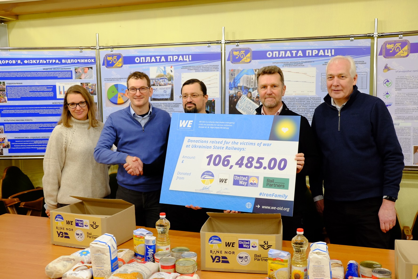 David Brown presents a cheque to the Ukrainian railway workers trade union